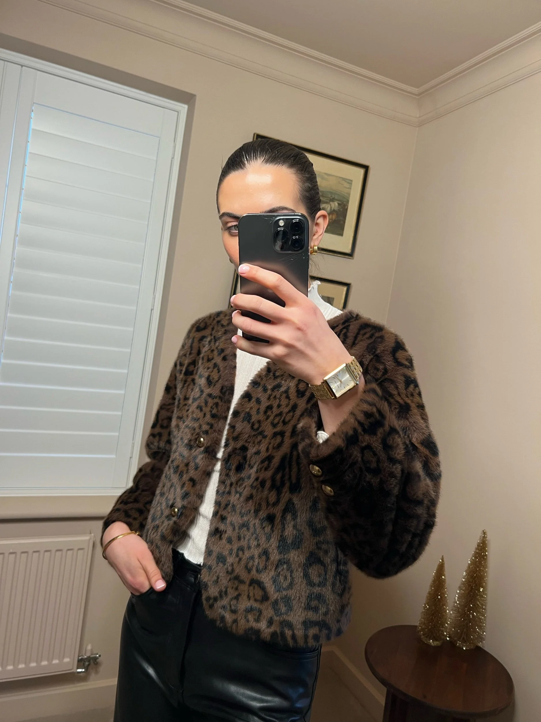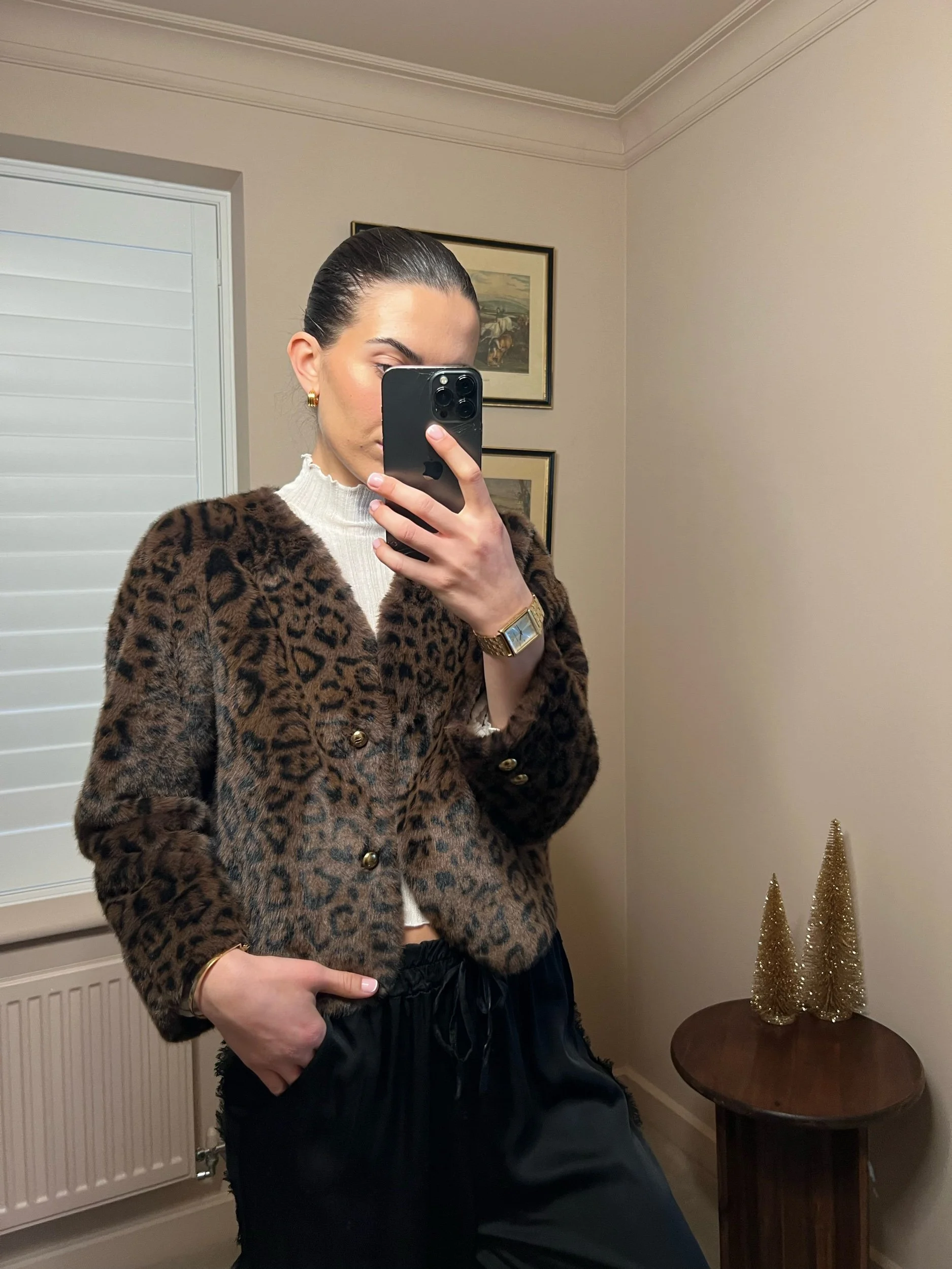 A luxe faux fur in a bold leopard print, designed to elevate any evening look. Soft, warm and effortlessly statement-making, it layers beautifully over a slip dress or pairs perfectly with PU trousers for a polished night-out finish.