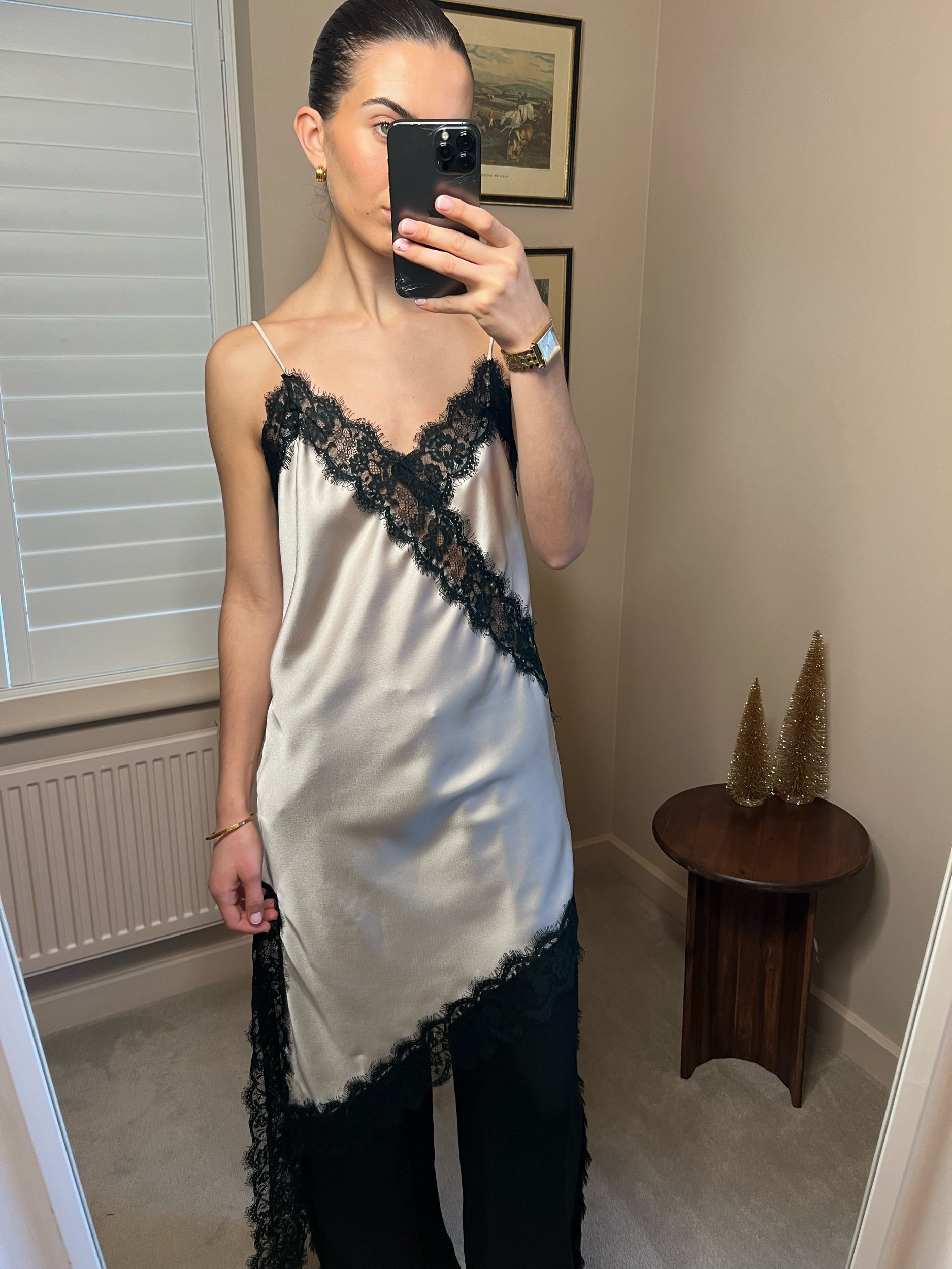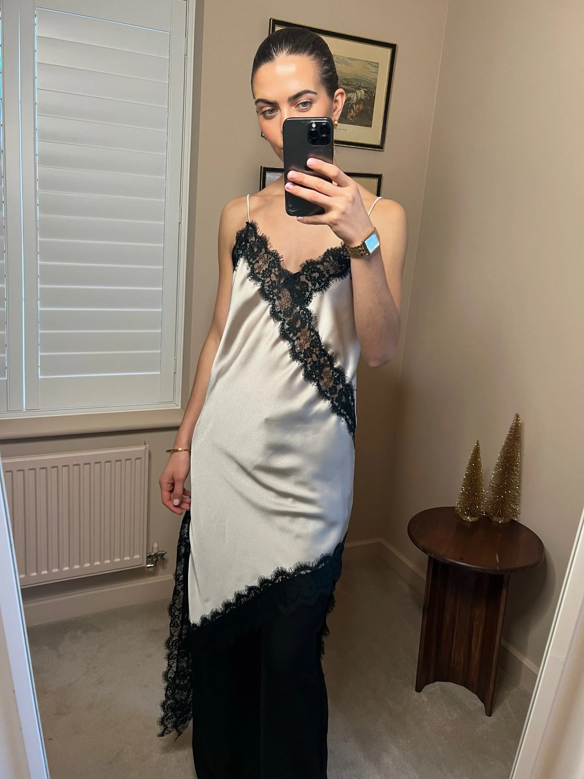 A satin slip with delicate lace trim that skims the body in the most effortless way. Wear it on its own for evening plans, or layer with an oversized knit for that laid-back, luxe feel.